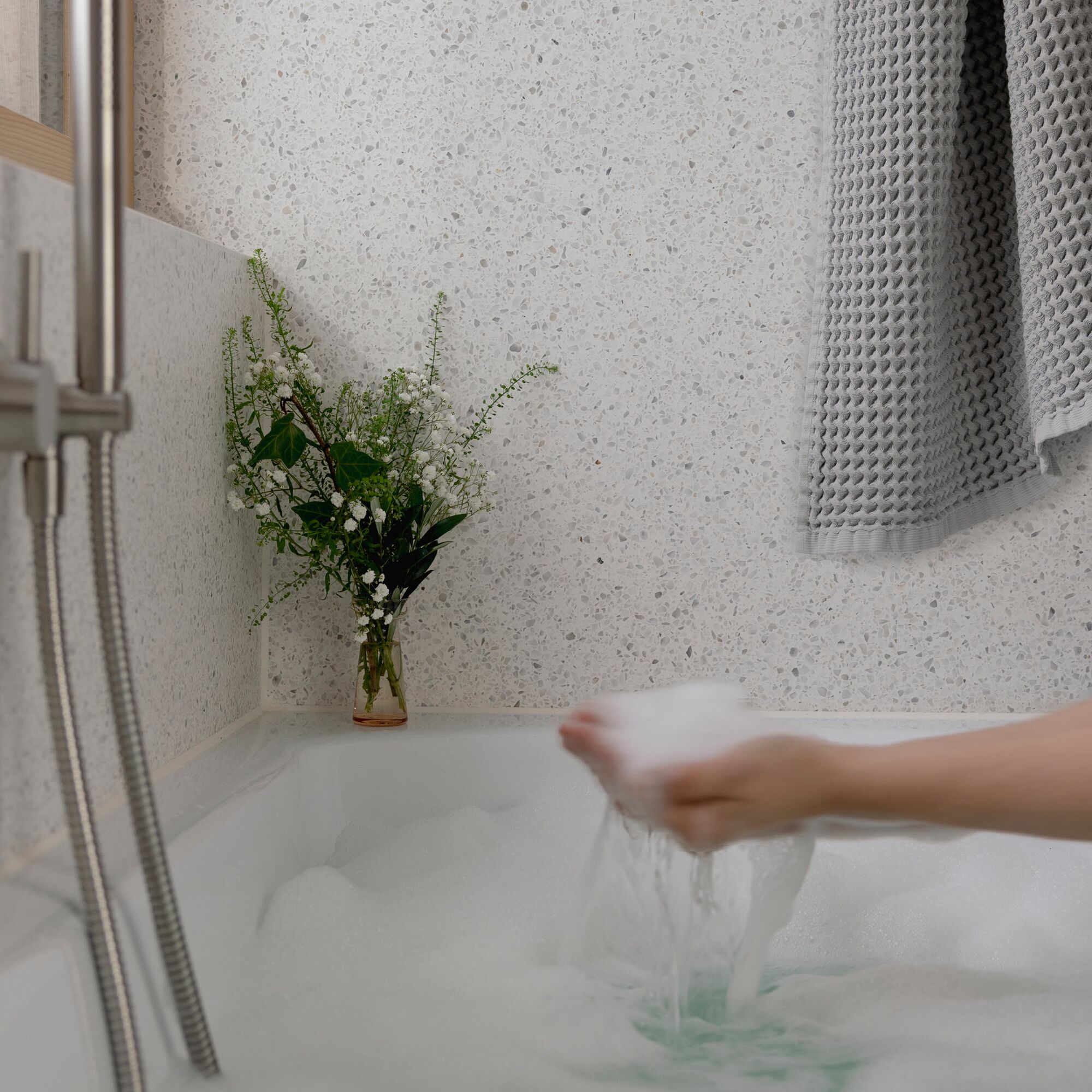 Helles Terrazzobad, prasselnde Regendusche, Badewanne mit Ausblick